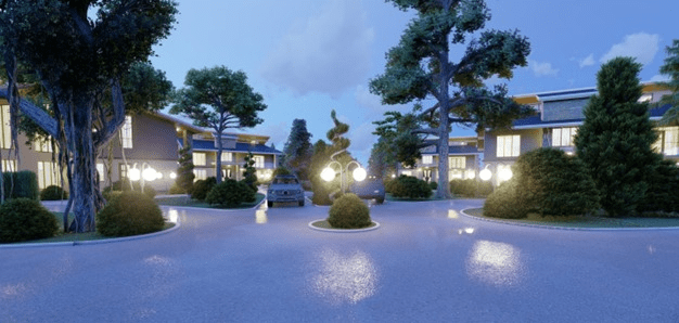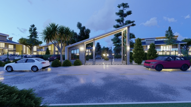 Common parking areas, landscaped gardens, and a jogging track that weaves through the