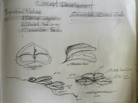 draws from nature: dense vegetation, shaded tree canopies, and jacaranda trees define the